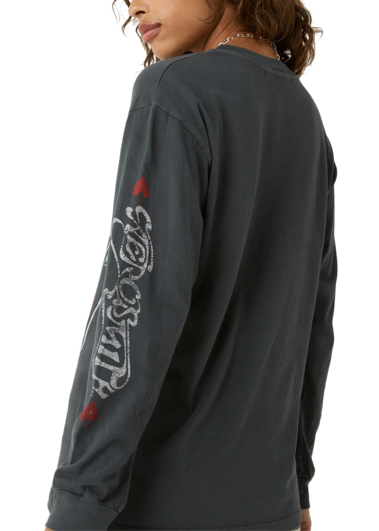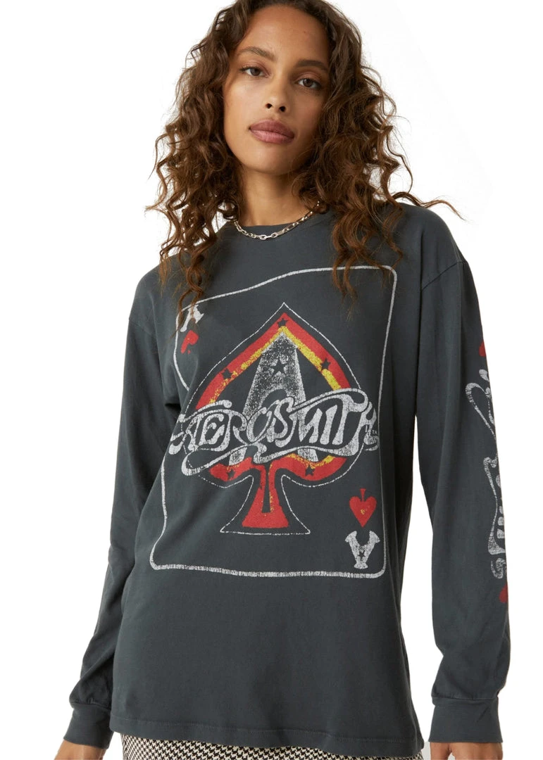 The Bad Boys from Boston were the epitome of a hard rock band. Classic album after classic album and controversial wild antics rocketed them to the best-selling American rock band of all time, selling more than 70 million albums in the US. Tyler and Perry were no joke – soaring the group to 25 gold, 18 platinum and 12 multi-platinum albums. No question, Aerosmith holds the most awards by any American group, not evening mentioning their Grammy glory. Continuing to make iconic headlines, Aerosmith lands on this Ace of Spades Oversized Long sleeve featuring the group’s logo in an ace of spades playing card graphic and left sleeve hit.