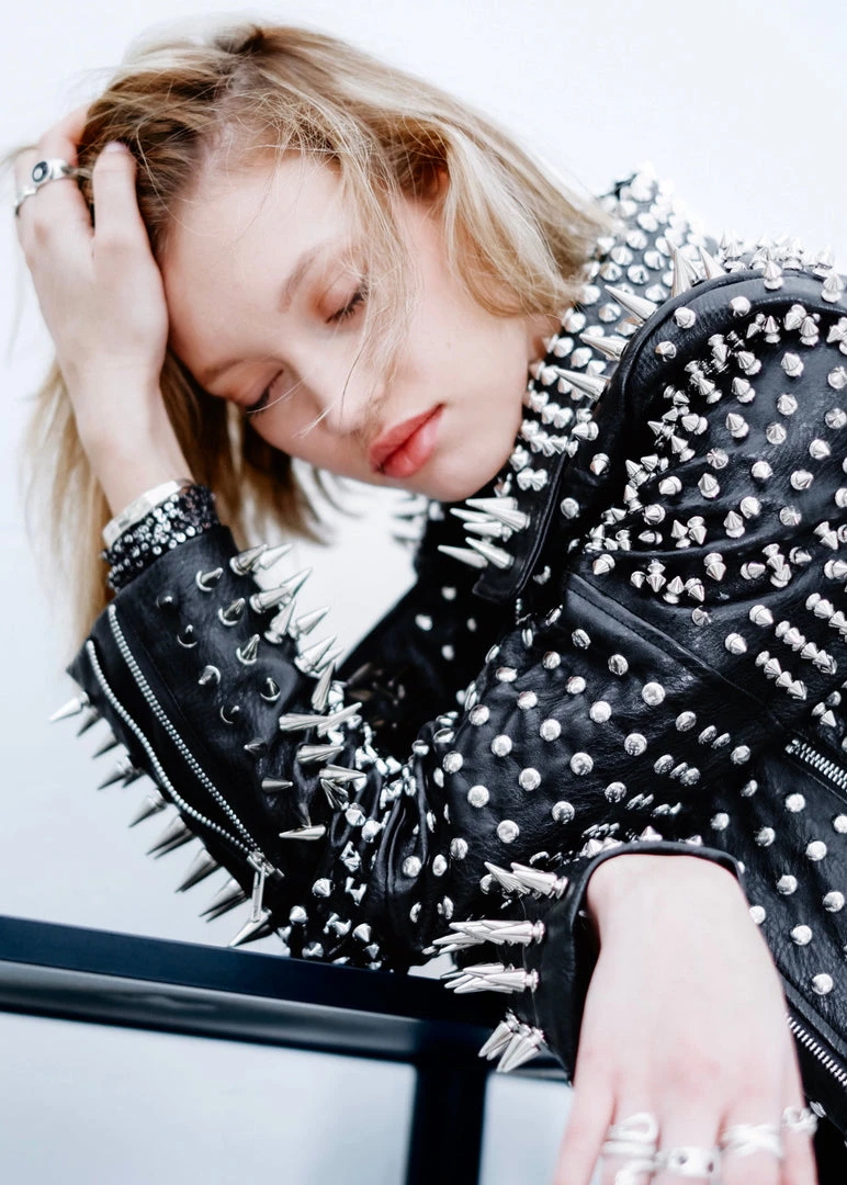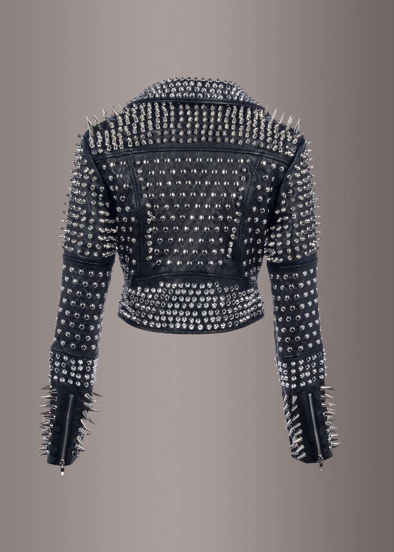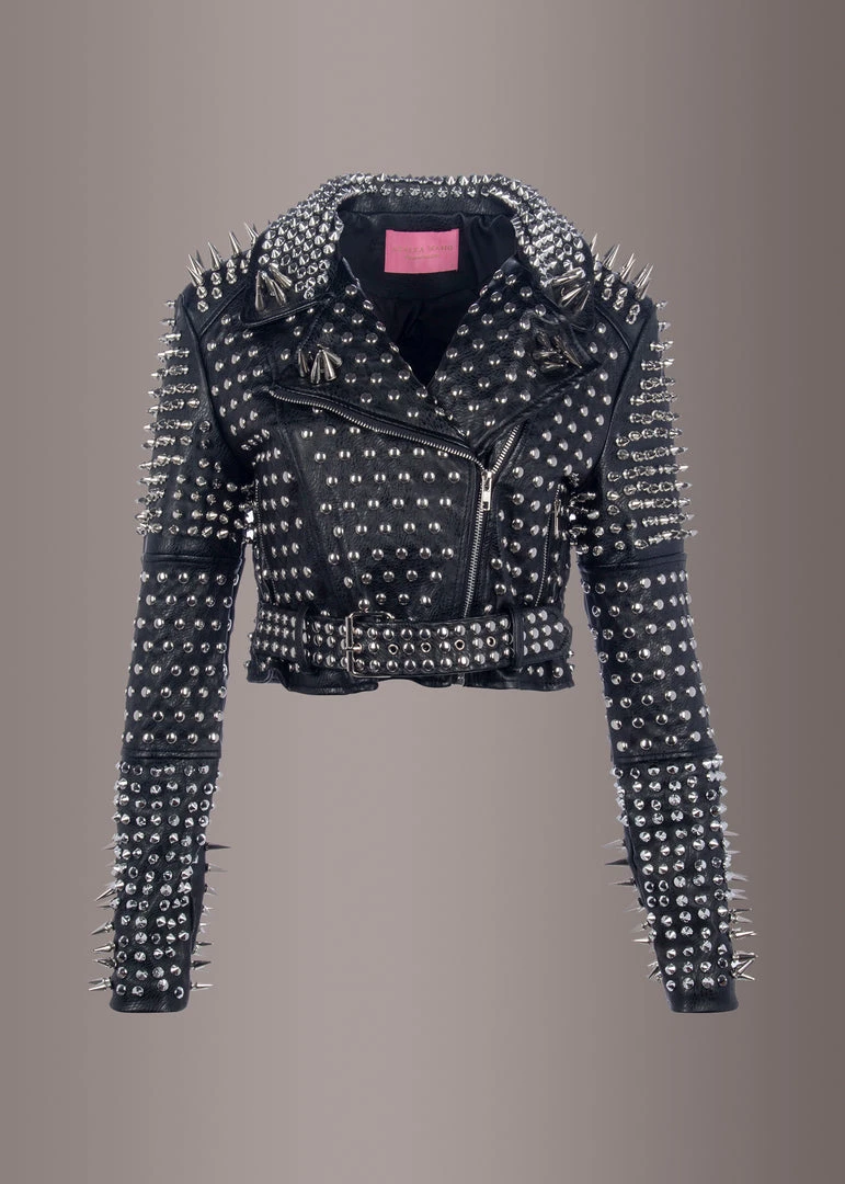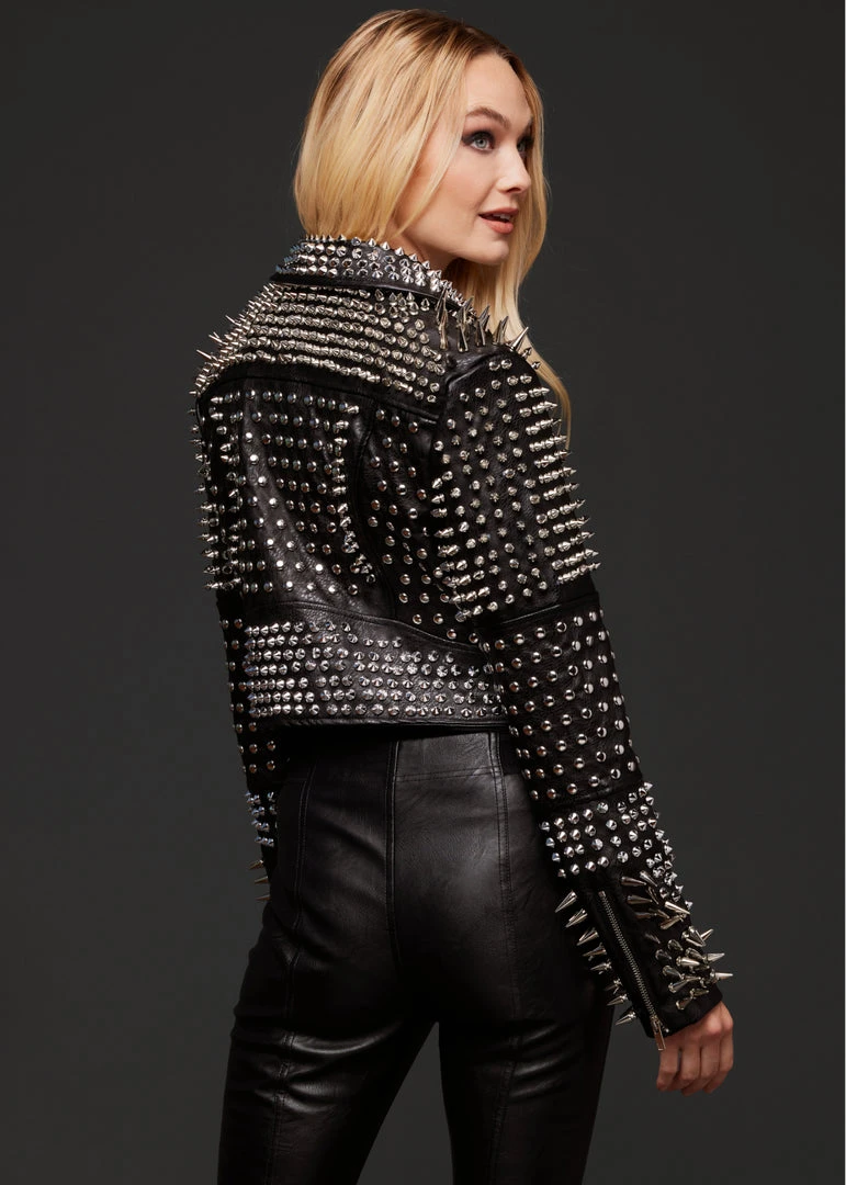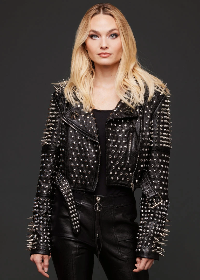Add some rock ‘n’ roll edge to your wardrobe with this faux leather jacket that is accessorized with silver colored studs allover.