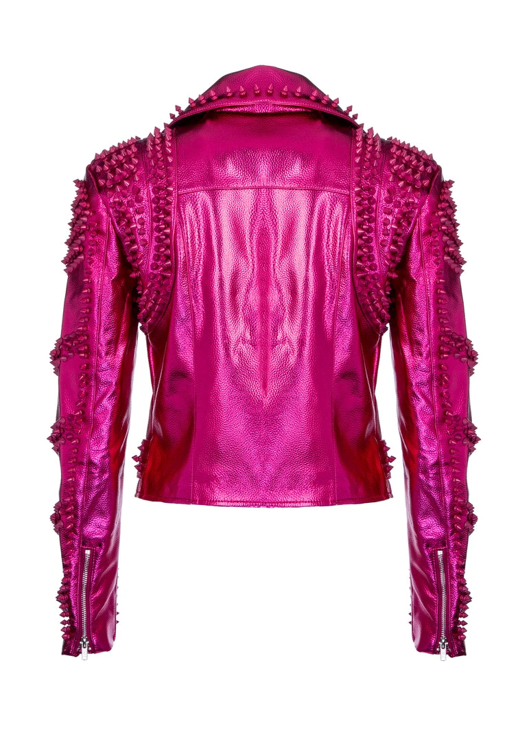 This faux leather piece features a pink metallic base, tonal spike studded detailing, silver hardware, a lapel collar, long sleeves and a zip front design.