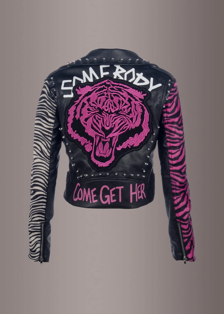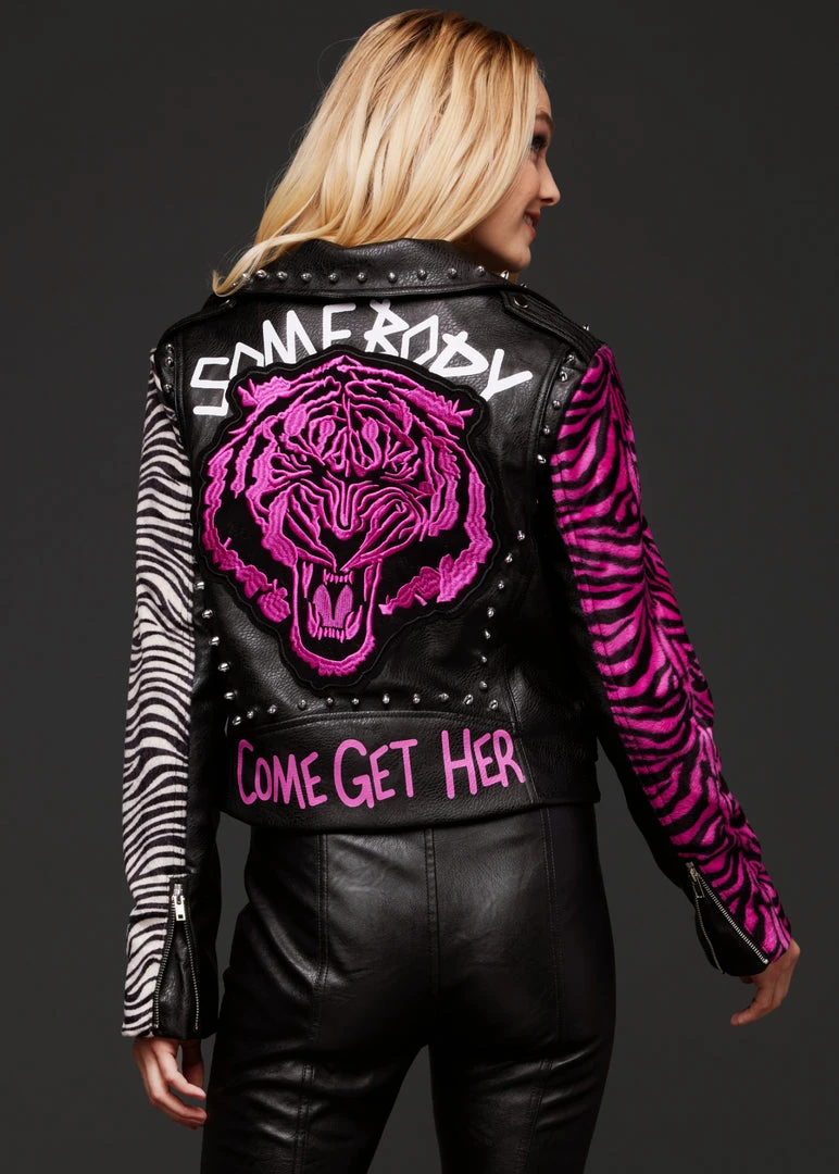 Flaunt plenty of style in this one of a kind biker jacket that is made out of soft black vegan leather and accessorized with silver colored studs and graffiti lettering in the front and back as well as a rad tiger patch in the back and animal print sleeves.