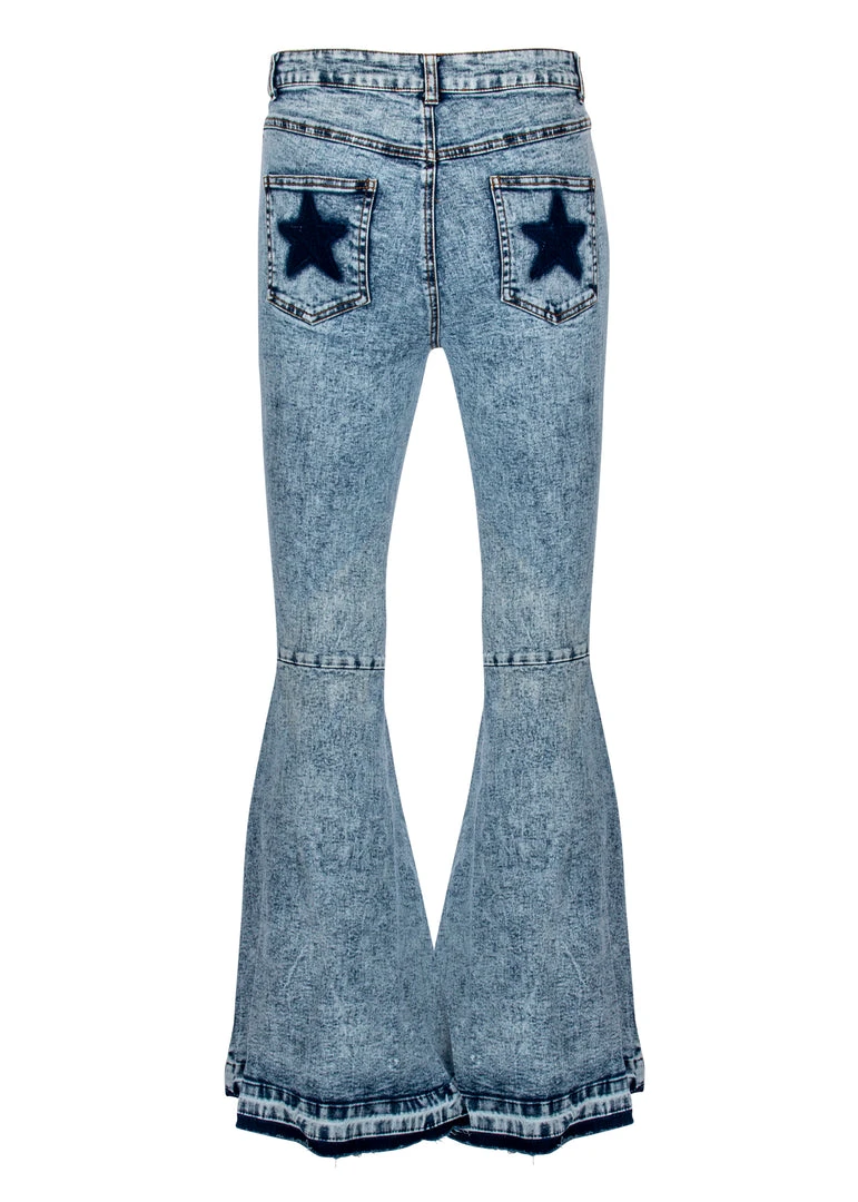 A star design on the back pockets, button front closure as well as a frayed hem rounds up the ’70 swagger of these acid wash denim bell bottoms.