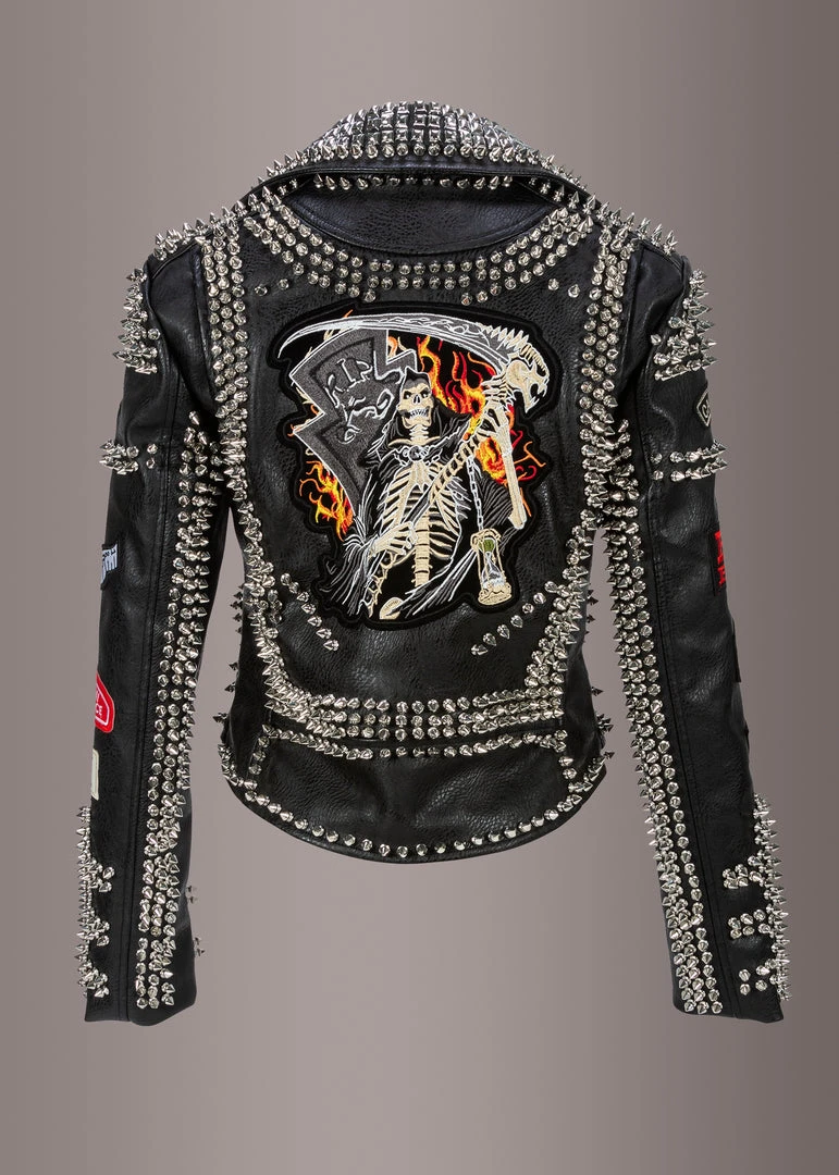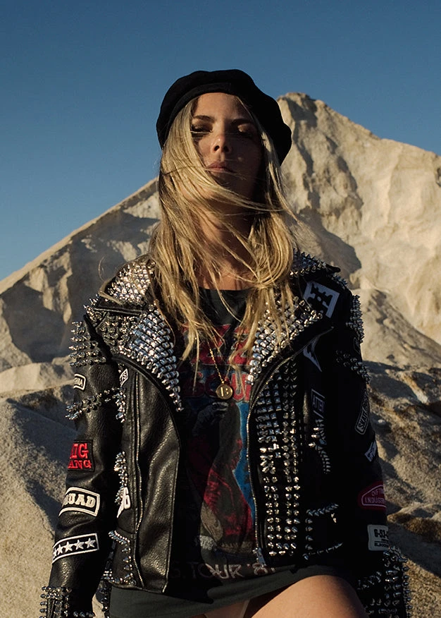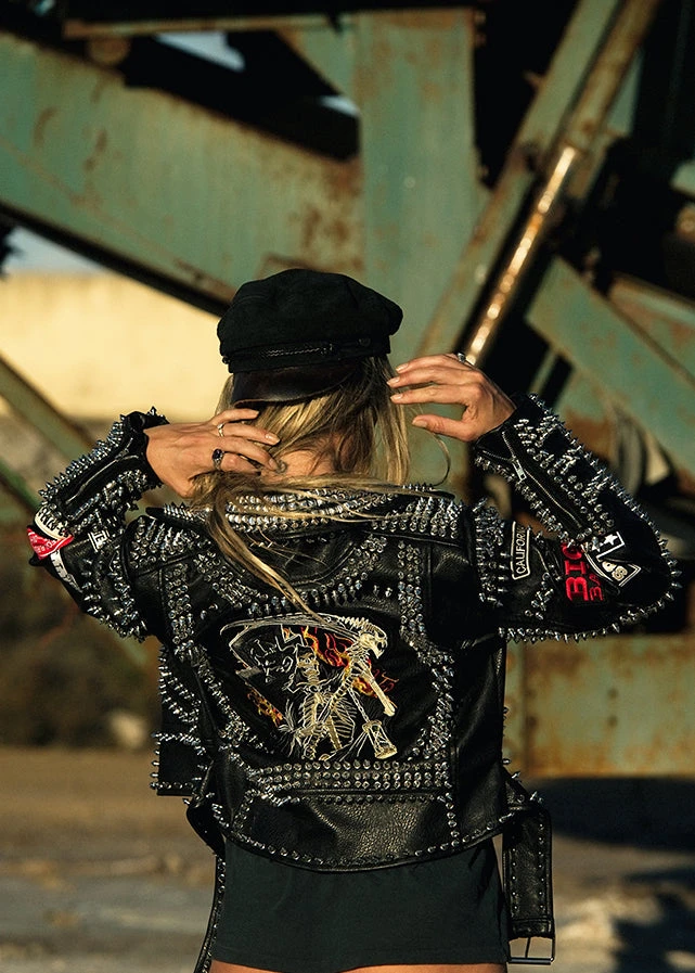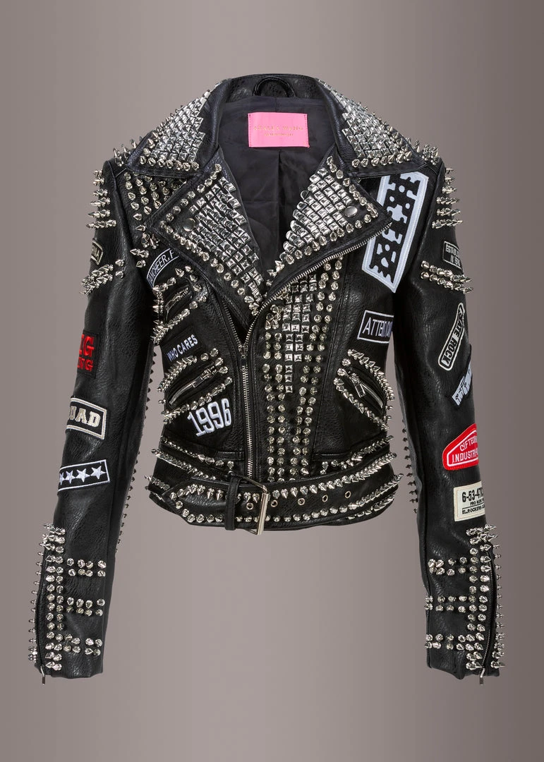 Channel your inner rock star! You will be obsessed with this studded moto jacket! The black faux leather jacket has a classic punk rock moto jacket design, and is embellished with silver colored studs throughout.