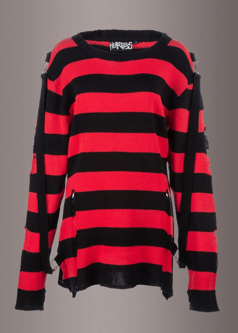 The oversized black and red striped sweater boasts a soft knit with several intentional rips throughout. Edgy buckles with detachable black straps complete the rad look.