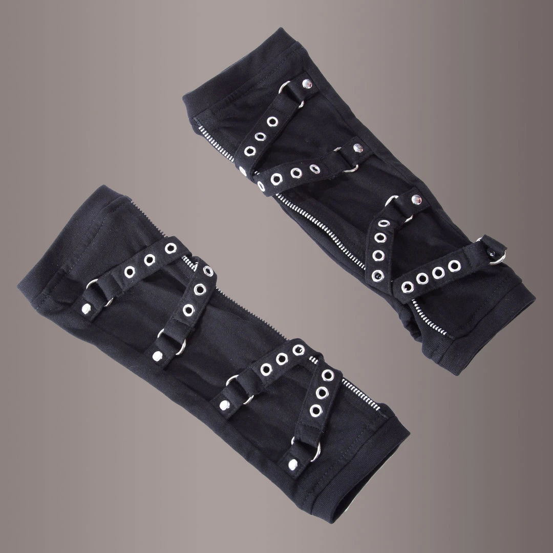 The very soft and warm arm warmers are accessorized with edgy buckle and stud details.