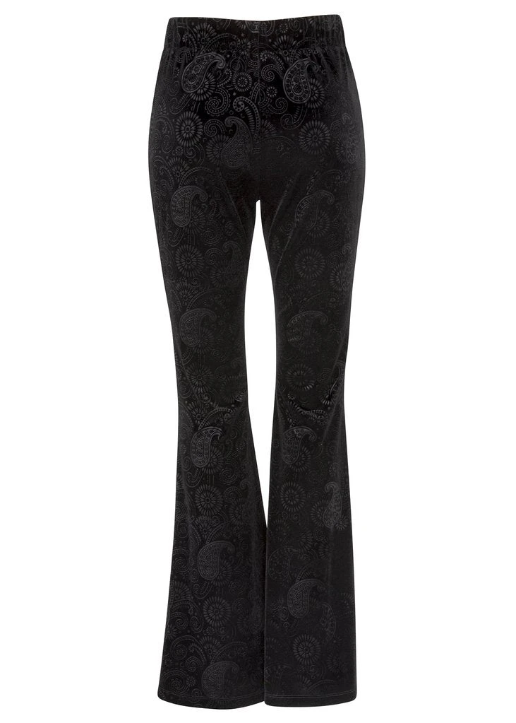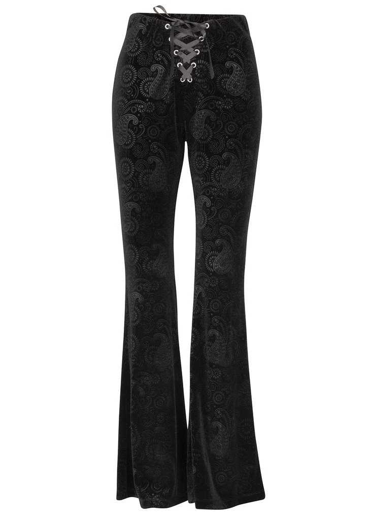 Show off those legs in these essential, retro-chic velvet flares that flatter any ensemble. The pants are made out of a lush black velvet fabric that has a beautiful subtle paisley boho inspired burnout pattern. These pants are cut slim fit from the hip through the knee that flares to a bell bottom leg. Pull-on elastic waistband with stunning black satin lace up details.