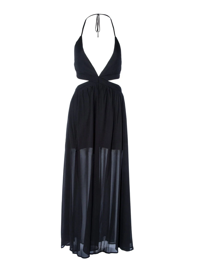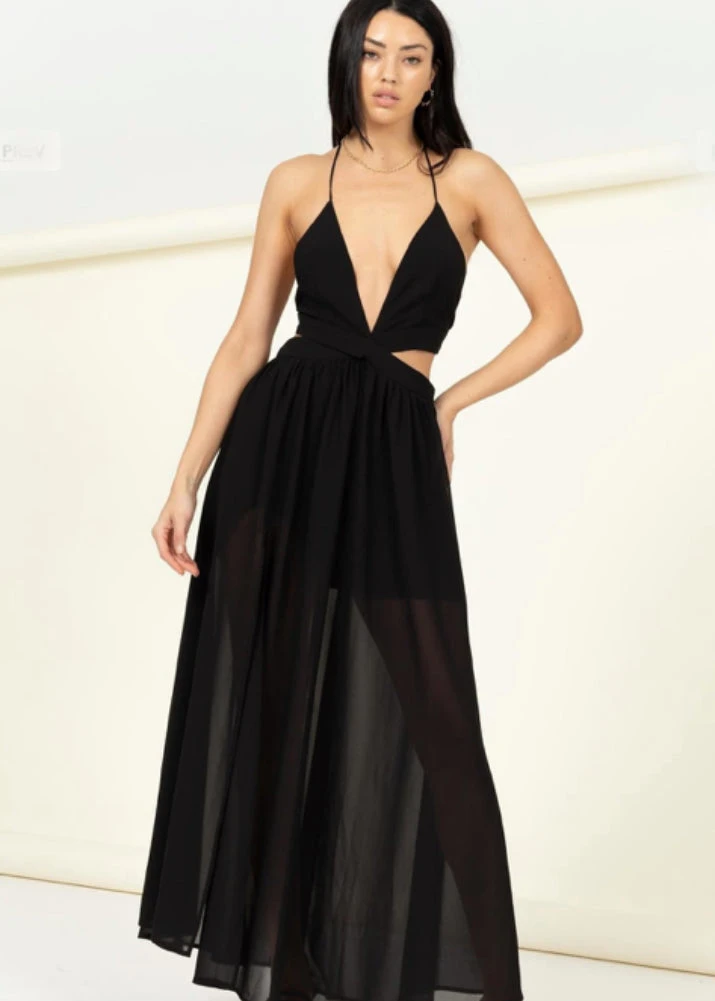 The long flowy dress features a deep v-neckline, halter neck cut, as well as ultra-fierce cutouts along the torso that will show alluring hints of skin.