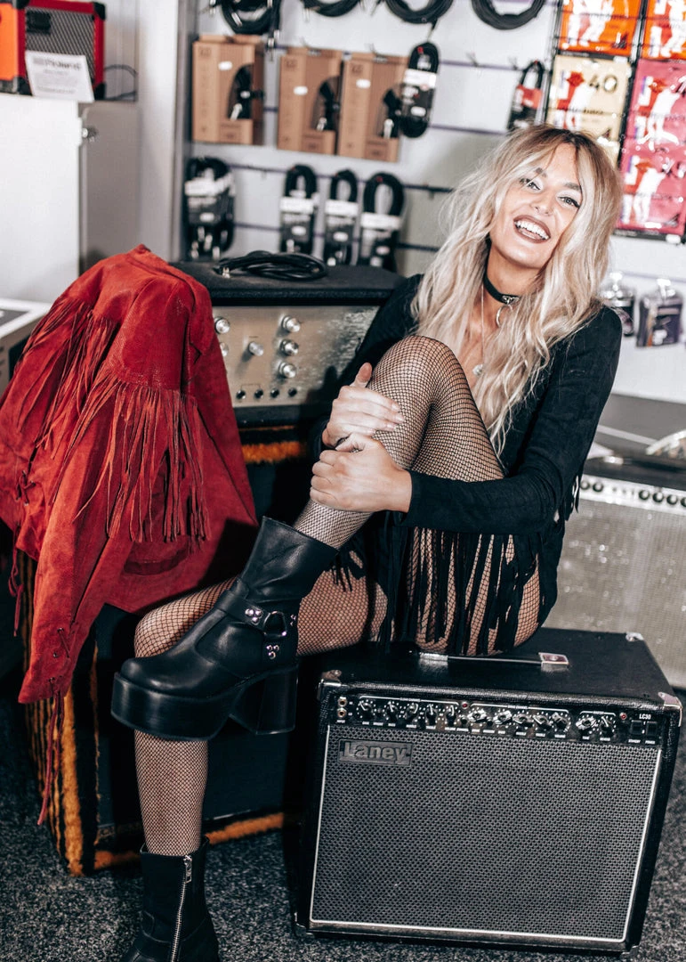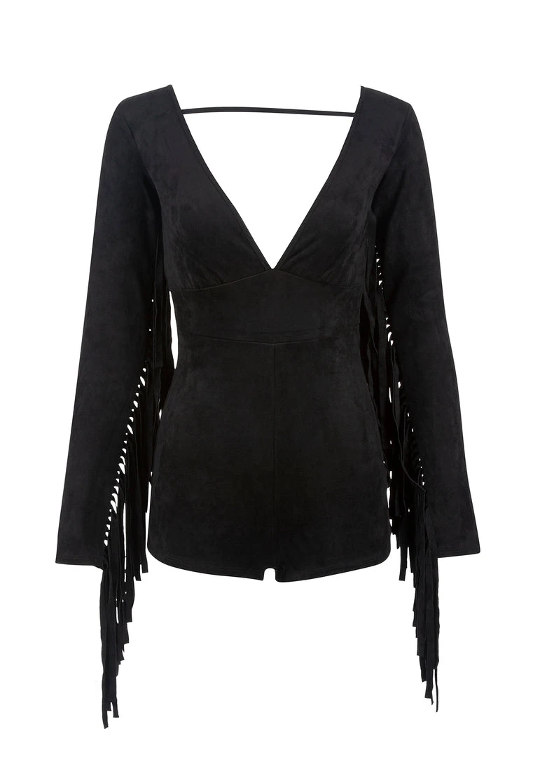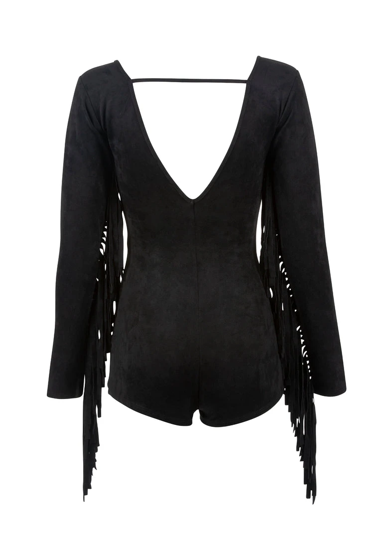You’ve always had a flair for the dramatic and this fierce black romper totally gets you. Made out of soft black faux suede, styled with long fringe trim sleeves and a plunging neckline, this is a one-piece that is worn to be wild.