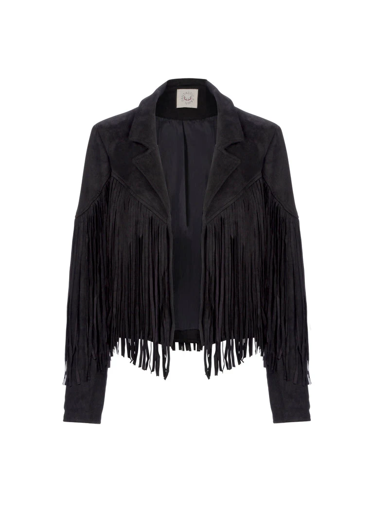 Add a cowboy-chic look to your wardrobe with this stunning black fringe jacket!