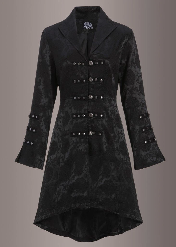 You’ll look nothing short of royalty in this stunning black brocade coat. This unique coat is crafted in a fabulous floral damask fabric offering a beautiful cut. The tailored fit as well as the ornate finish are just a few reasons that make this coat the perfect addition for your victorian inspired, steampunk, gothic or simply fashion forward outfit.