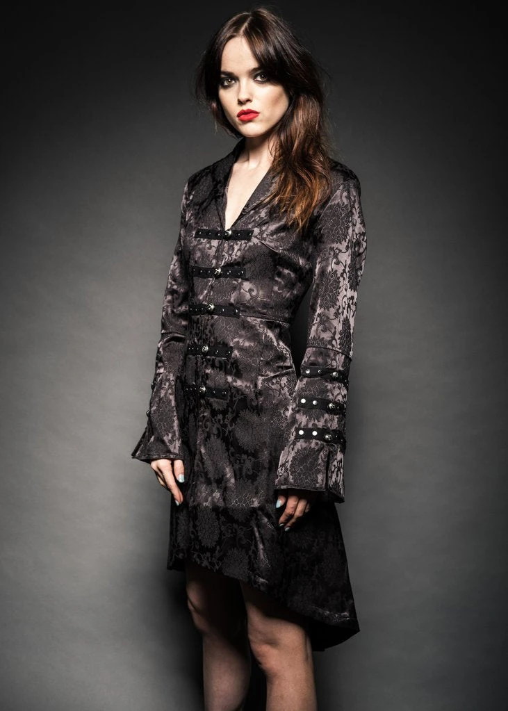 The coat also has a very flattering cut that is slim fit to the waist and flares into a high-low cut to the hem. Beautiful military style studs accessorize the cuffs as well as the front of the coat which fastens with ornate buttons. Gorgeous corset lacing in the back adds to the stunning style of the coat as well as to an adjustable fit.
