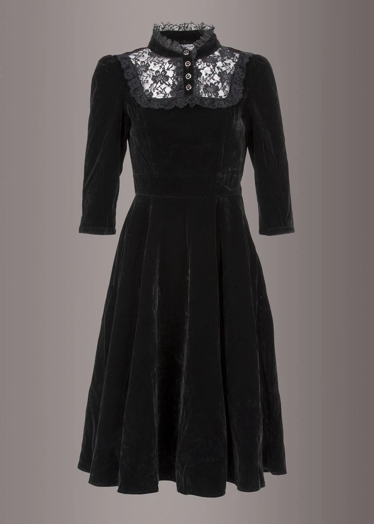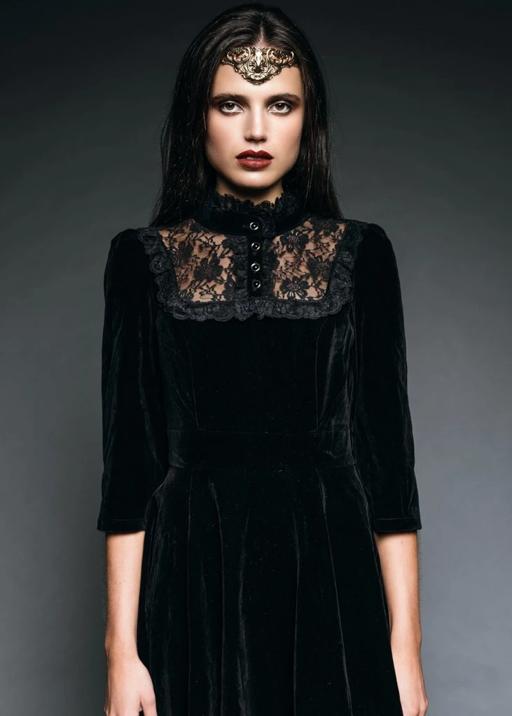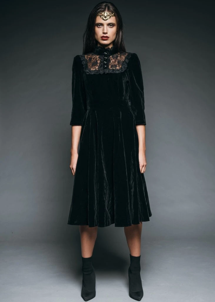 Back in black! Meet your favorite new dress! This black dress is fabricated out of lush black velvet and features a beautiful high neckline made out of black lace. The dress has a side zipper for easy on- and off.