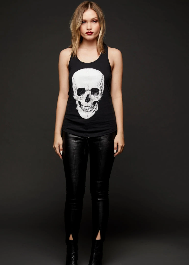 The rock ‘n’ roll attitude of this tee will have you ready to hit the road in style! Versatile, edgy and comfy, that’s the spirit behind this rad tank top! The black top features a beautiful skull design in the front. It is is fabricated from soft 60% cotton and 40% polyester, has a slightly looser fit cut and a racerback cut back.