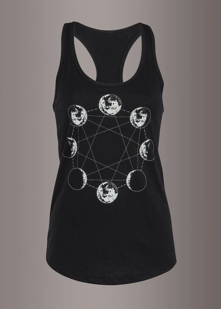 Add some celestial charm to your tank top collection with this beautiful top! This beautiful black top features a stunning moon phases design in the front.