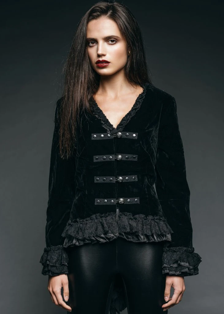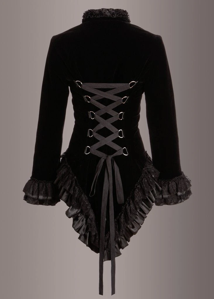 Add a little victorian touch to any ensemble in this gothic-inspired tail jacket! This elegant jacket is made out of lush black velvet and features beautiful lacing in the back, stud decoration, ruffles on the seams and a decorative button closure in the front. Put it on and look wickedly awesome!