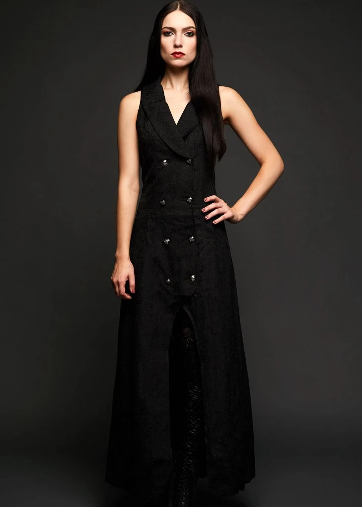 Stun them with your captivating style in this ultrafab sleeveless coat! This victorian inspired jacket is made out of soft black fabric that showcases a stunning, very subtle black on black paisley design. The jacket has a figure-flattering body hugging cut and closes with ornate silver colored buttons in the front.