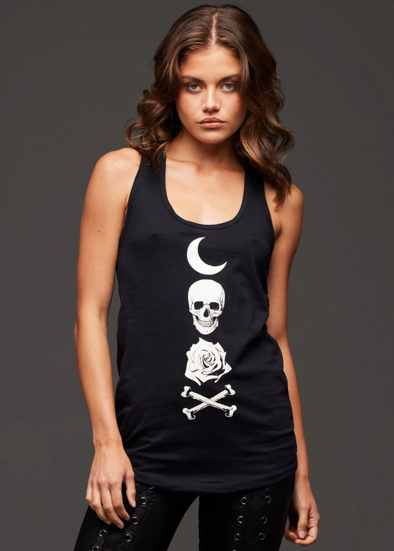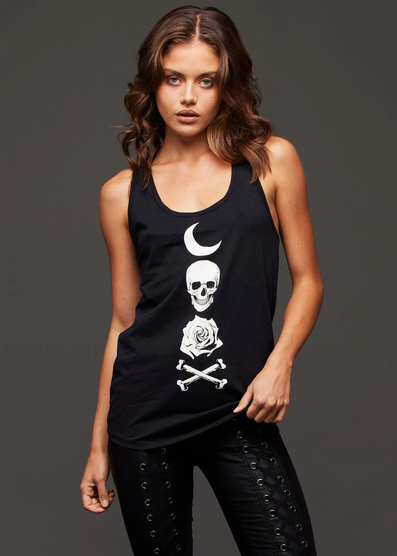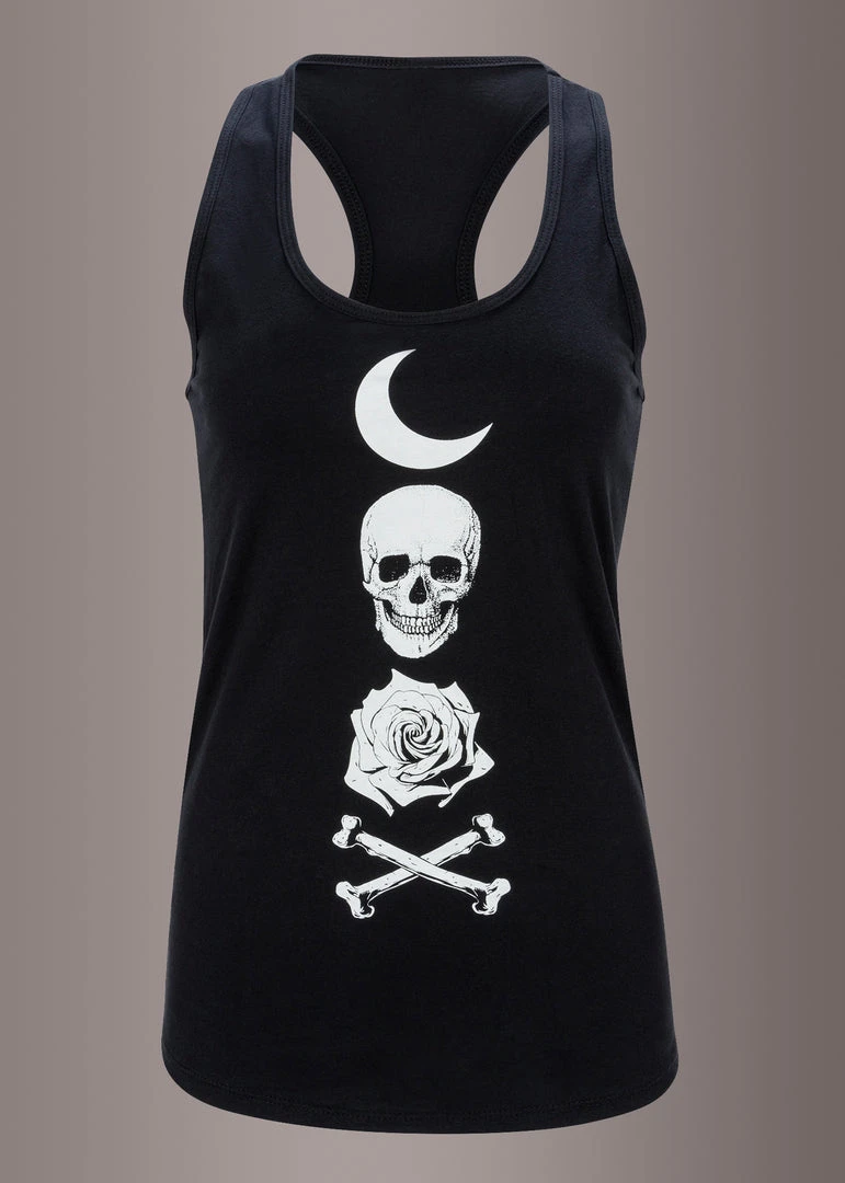 A beautiful crescent moon, skull, crossbones and rose graphic print embellishes the front of the black tank top.