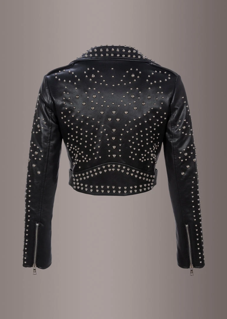 The jacket features a cropped length, a classic collar, snap button shoulder straps, zipper pockets, long sleeves and semi-circular studs throughout.