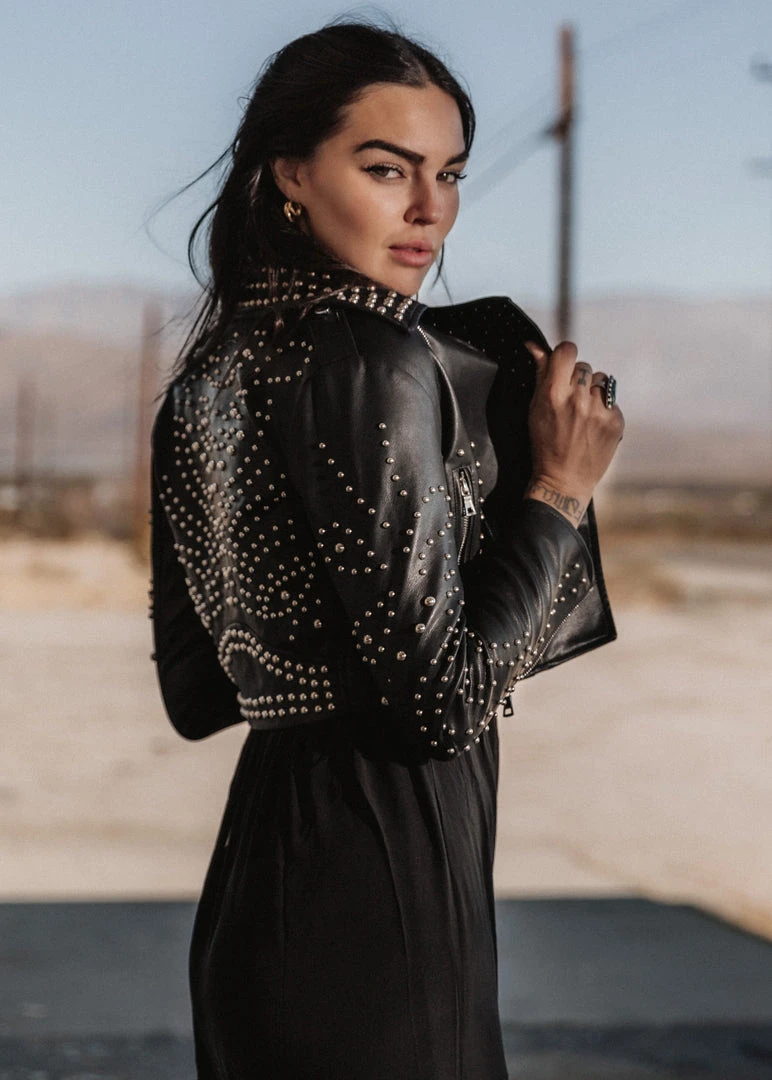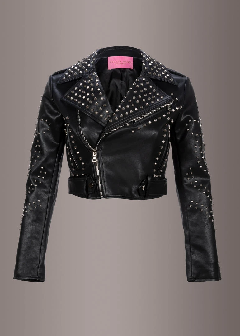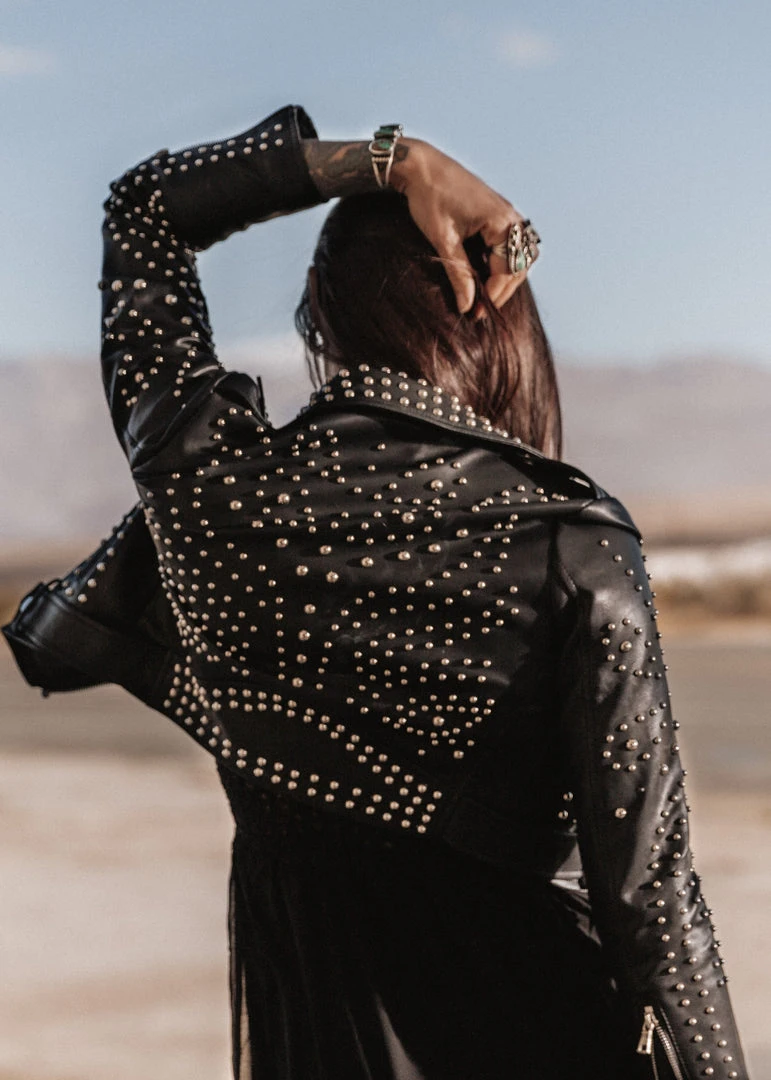 Revved up and super rad, this luscious faux leather moto jacket doesn’t miss a single detail, from the zippy bits to the studded details.