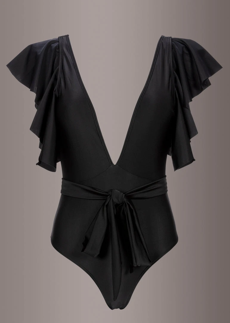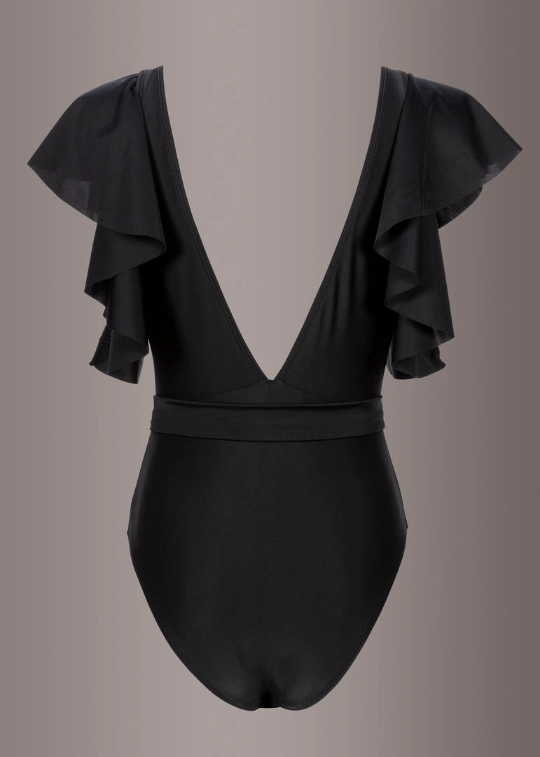 Show off sun-kissed skin in this one piece swimsuit that features a plunging deep v neckline, removable soft pads, a low cut back, beautiful ruffle details and a self tie belt. Â