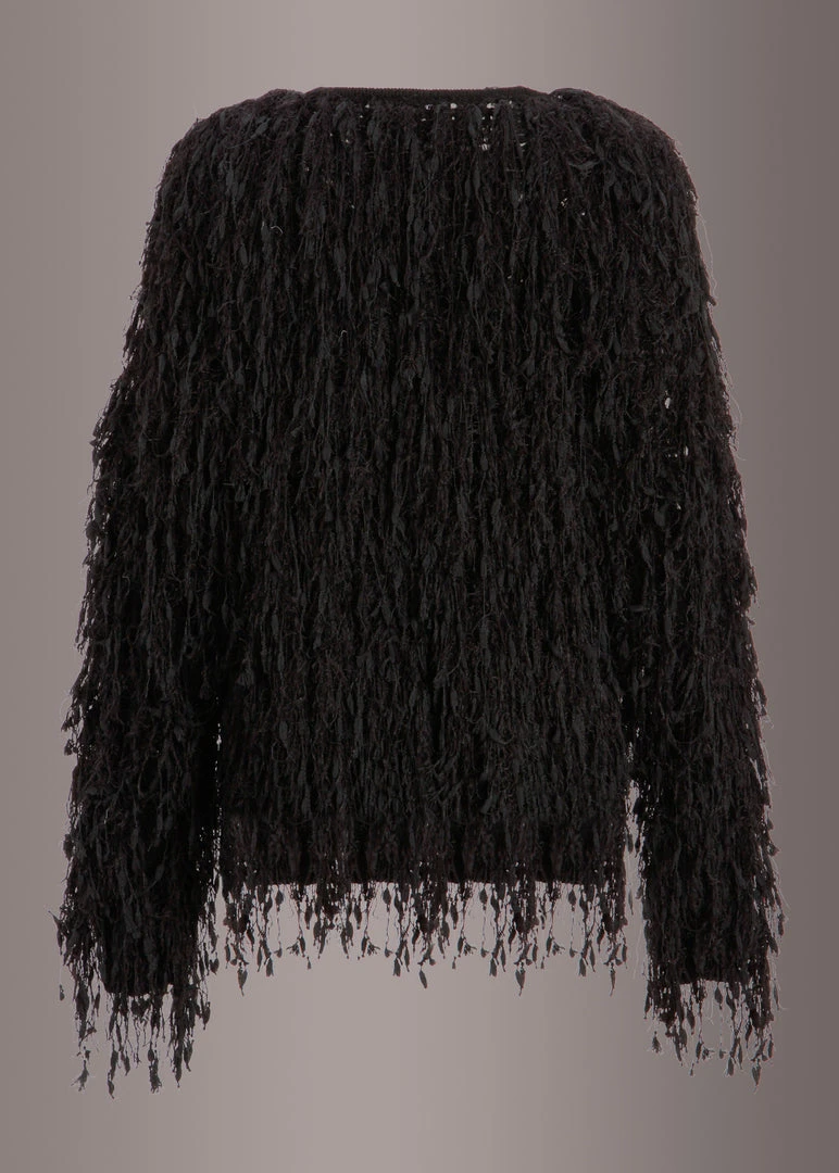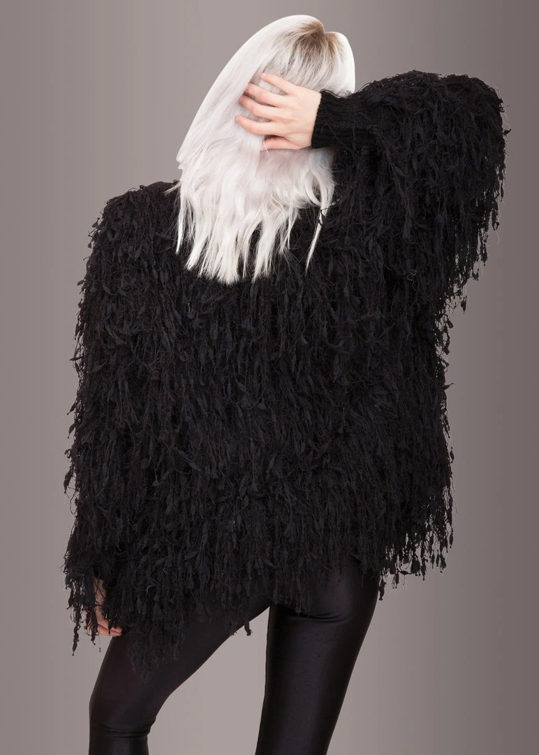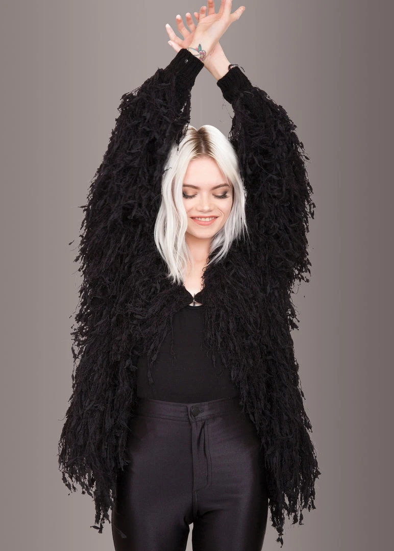 This rocking jacket is a sure winner in your wardrobe! The one of a kind cardigan is accessorized with beautiful fringe throughout the jacket that gives it a shaggy faux fur look. This open jacket has long sleeves,a top hook closure and a straight hemline.
