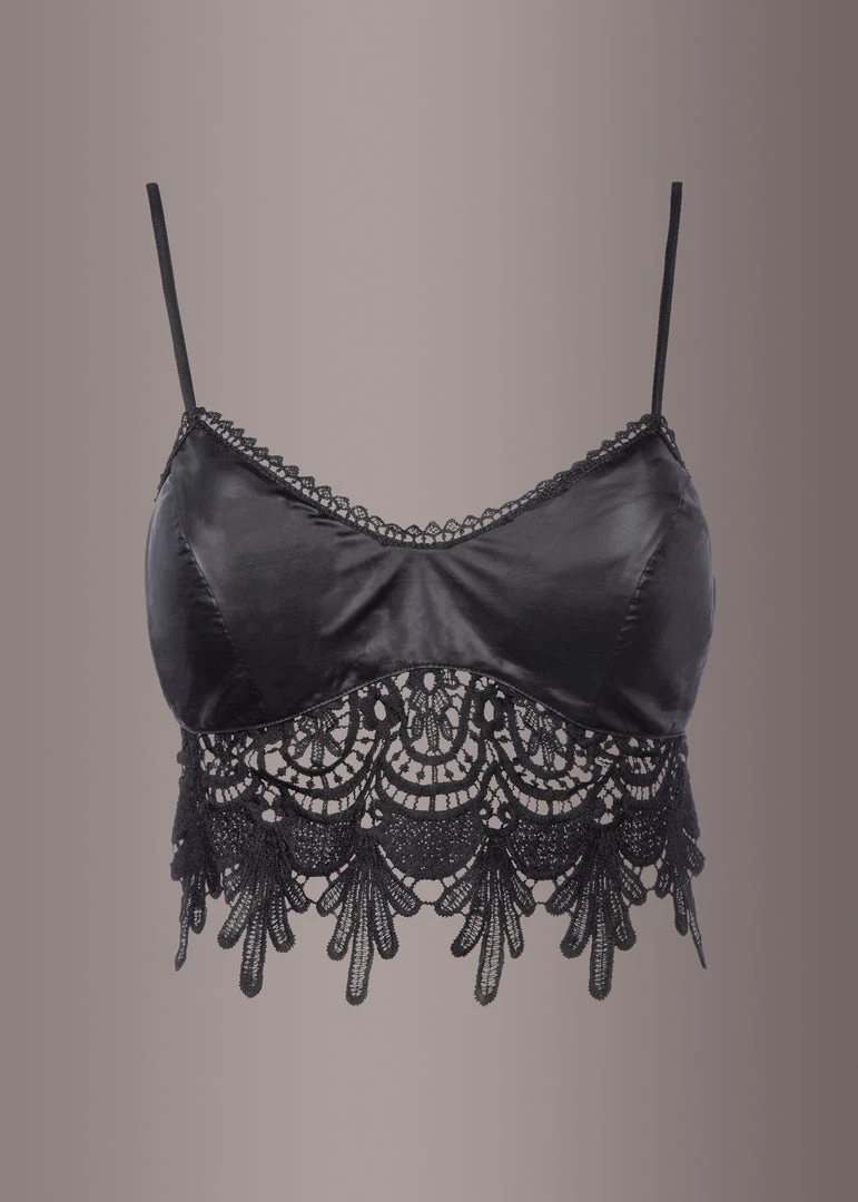 Let your inner rebel shine through with this bralette top! This bustier style top is made out of smooth, black faux leather. The top features adjustable spaghetti straps, beautiful black lace trim and a back zipper closure.