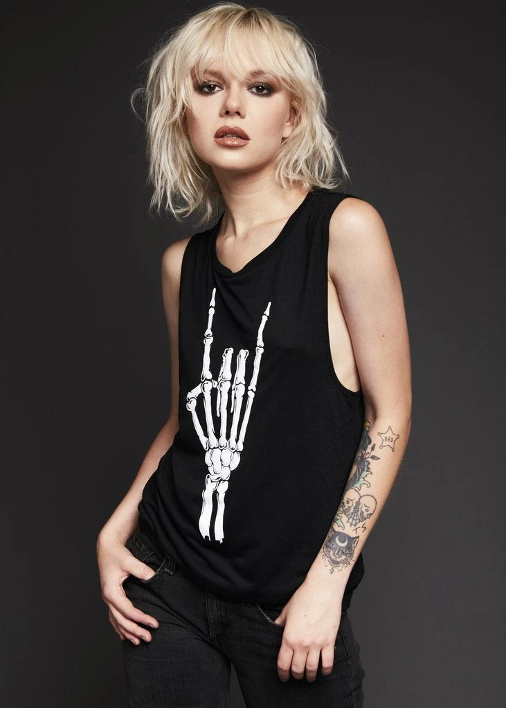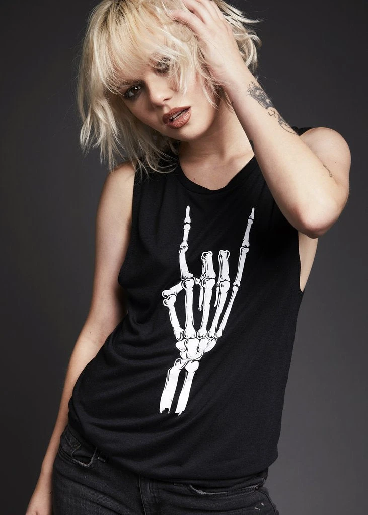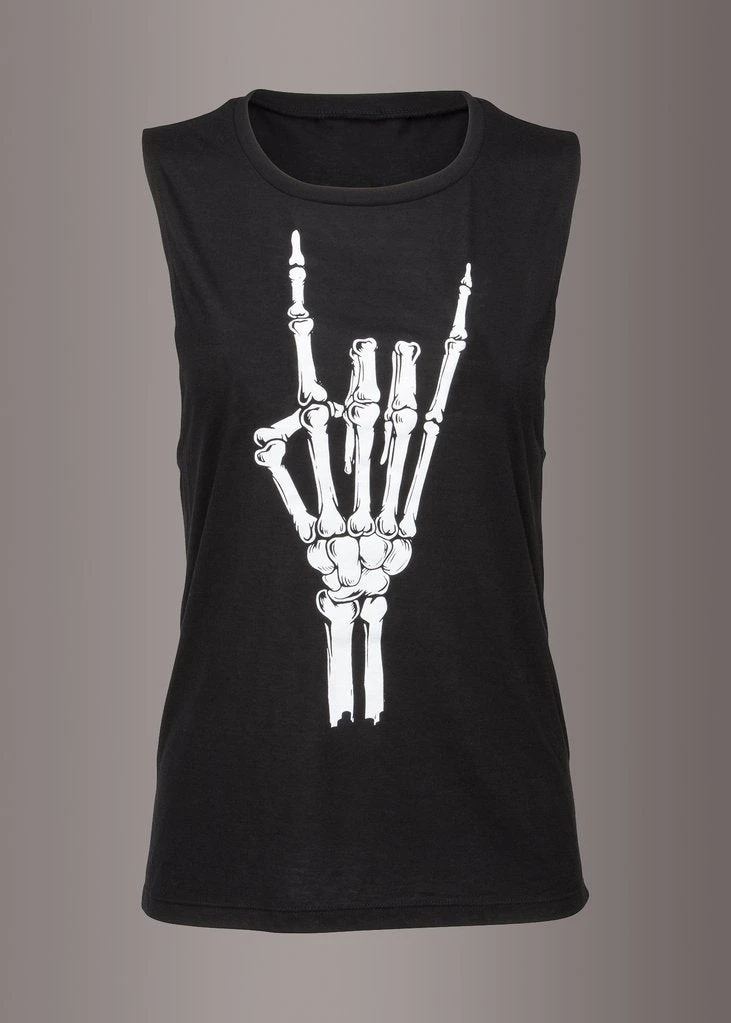 For the metalhead with a love for the macabre, this skull-graphic tank top achieves a cool, edgy attitude. A feminine version of the muscle tank, this must-have style is designed with an exceptionally soft fabric that softly drapes around curves. The modern elongated armholes and curved bottom hem make it perfect for layering.
