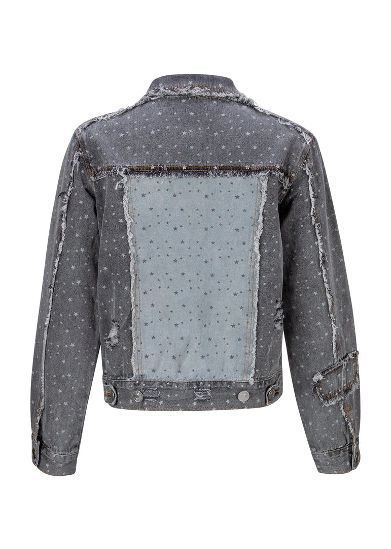 A rad star design throughout, color block details, a frayed hem and distressed seams as well as the oversized fit makes this jacket the perfect denim layering piece.