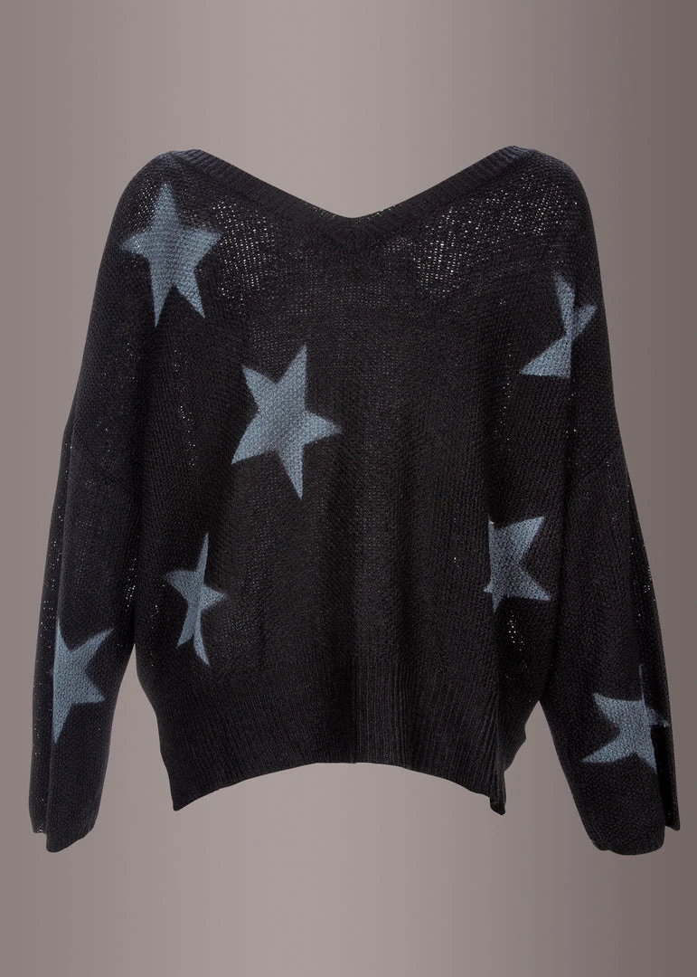 Give your sweater style an update with this black ripped sweater that features a stunning star design, long sleeves, a v neckline and a straight hemline.