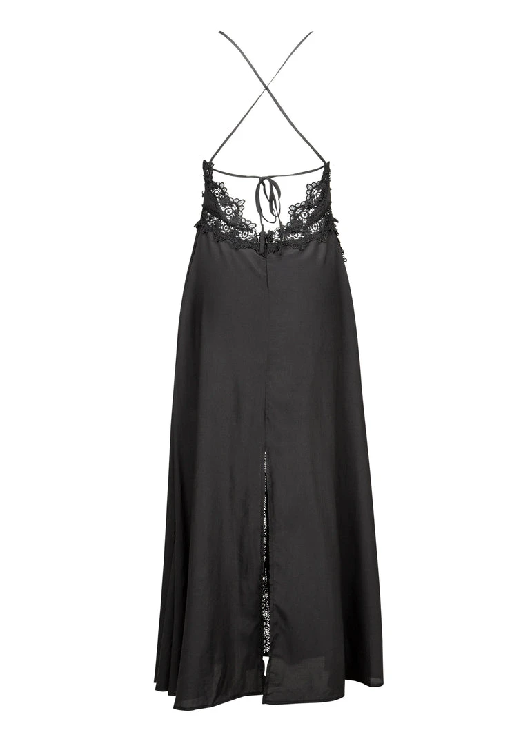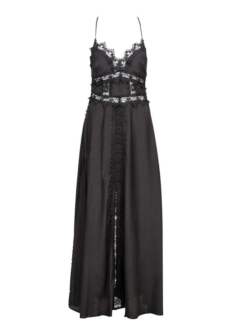 Soak up the sun in style with this effortlessly chic long black dress that features beautiful lace details that show off alluring hints of skin, a deep v-neckline, a strappy design and a backless construction.