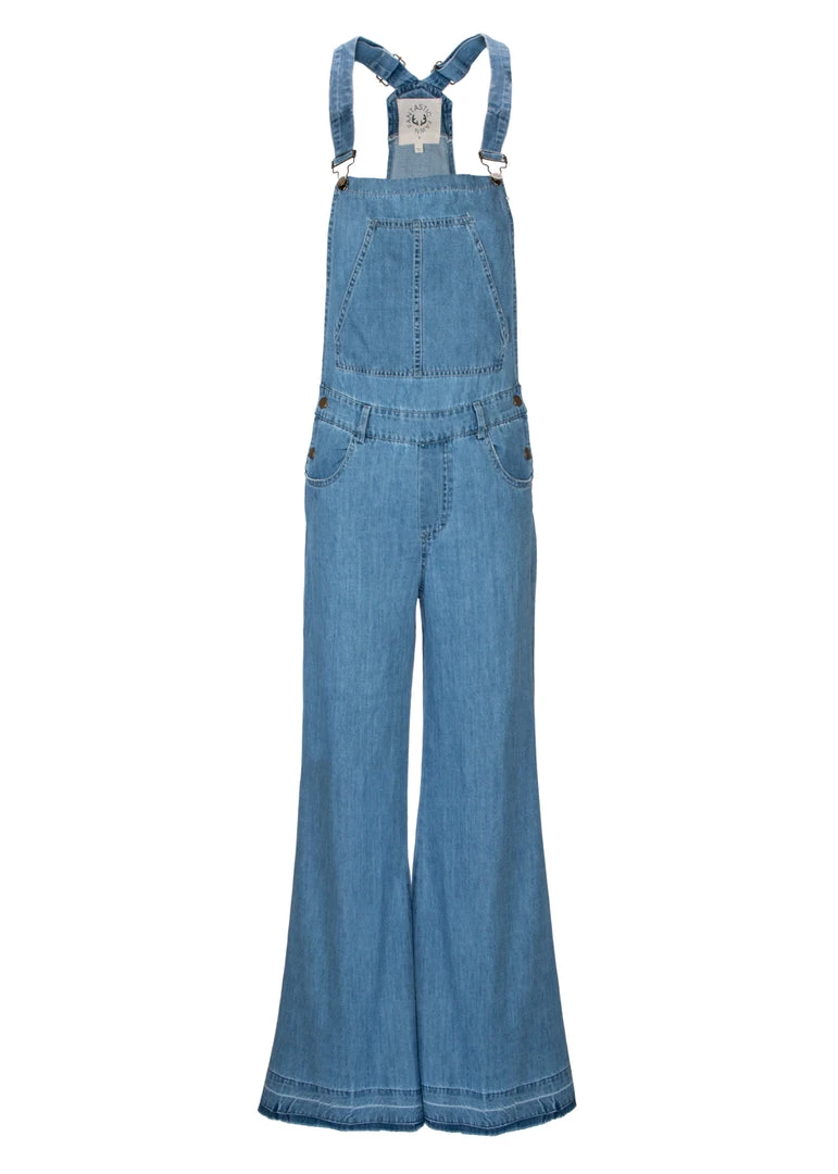 The jumpsuit has a straight neckline, adjustable shoulder straps, a fitted bodice with front pocket detail, belt loops and a long leg that hugs your curves through the thighs before flaring into a retro inspired bell shape below the knees.