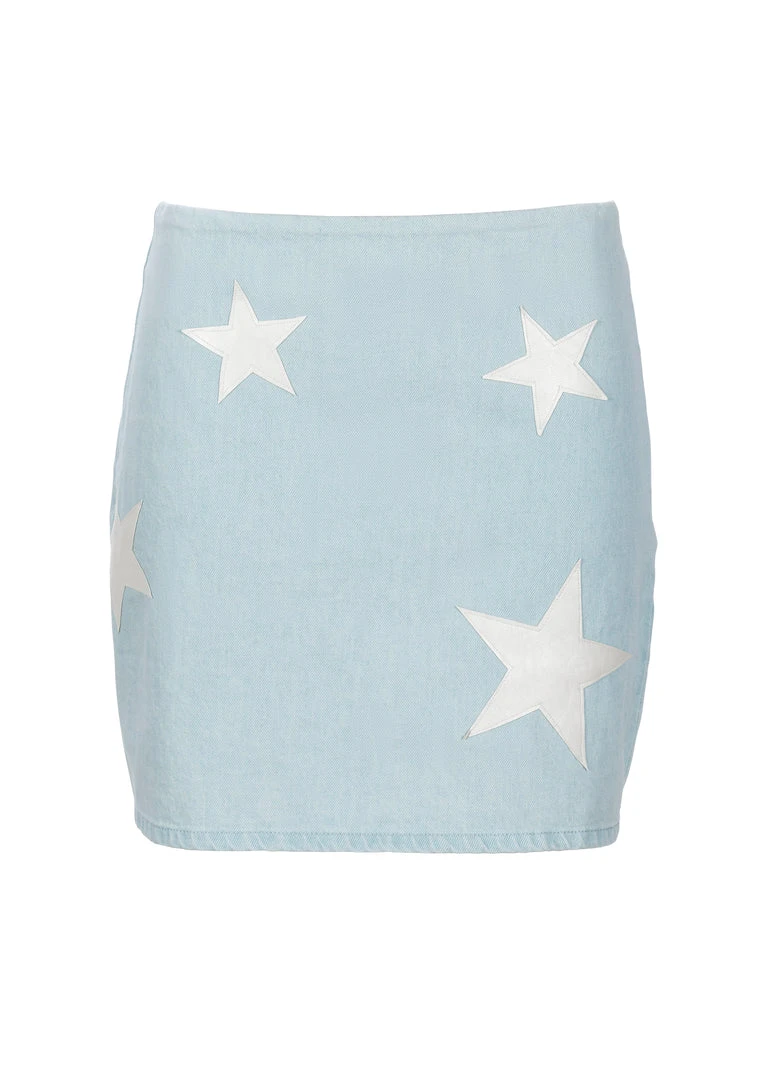 Set to be the baddest mini in your arsenal, this light denim wash skirt gives off stylish attitude with white faux leather star patches.