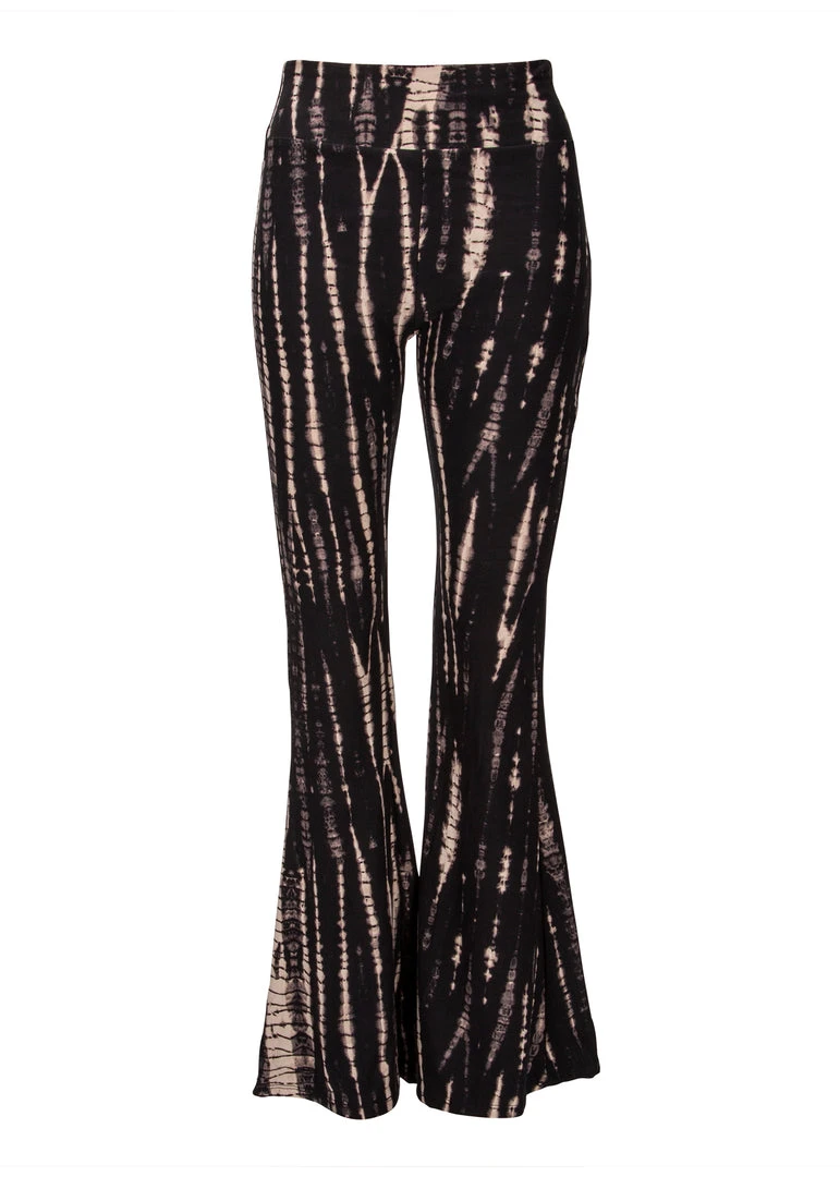These flares come in black and tan tie dye design that rounds up the moody ’70s swagger of these bells.