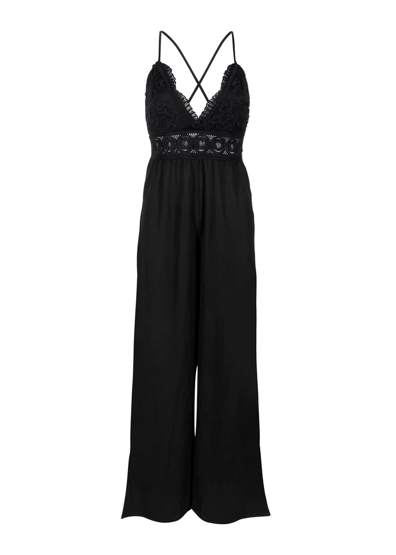 The black woven jumpsuit features a deep v-neckline, adjustable spaghetti straps, a floral lace bodice, a sleeveless cut, a crisscross back with self-tie support strap, a wide leg, and a full length.