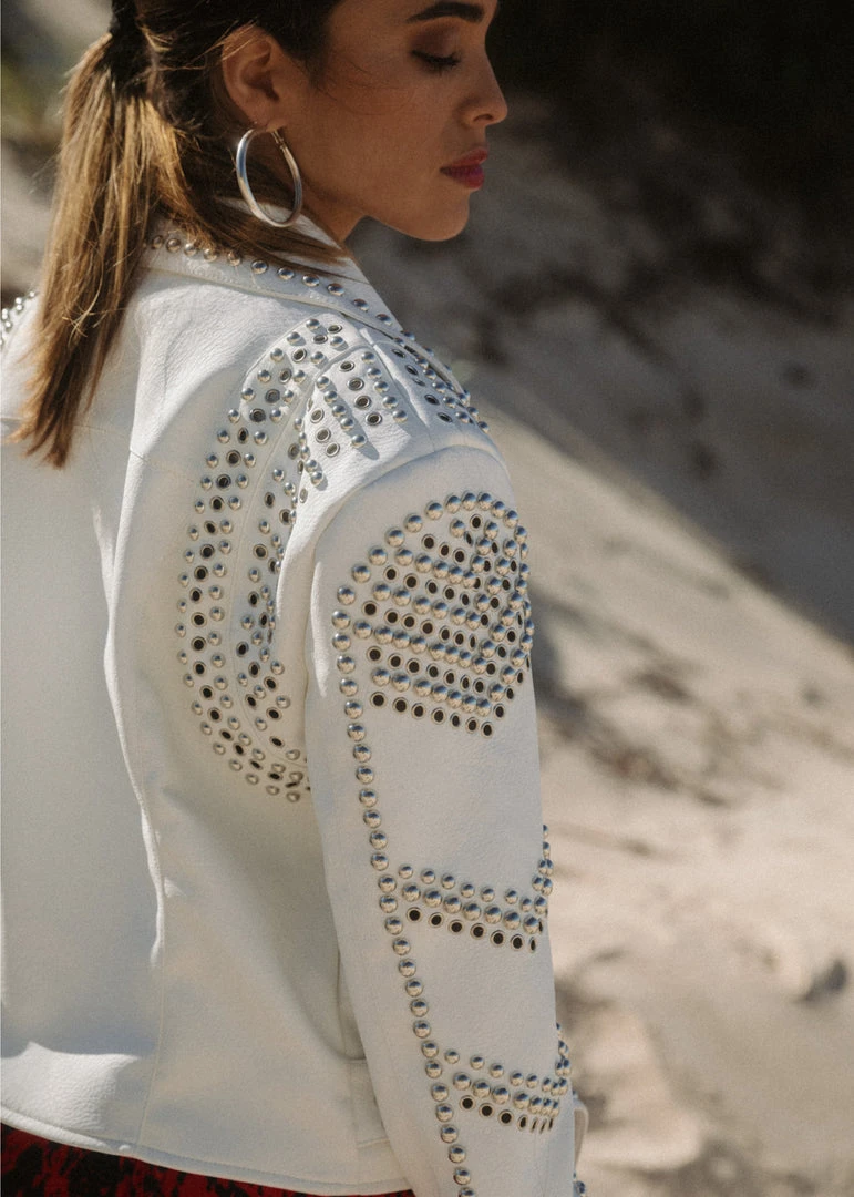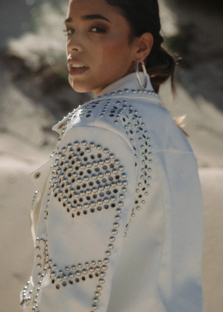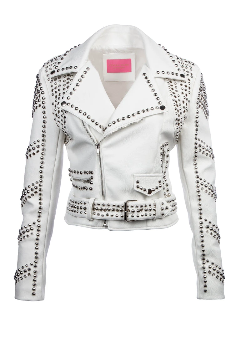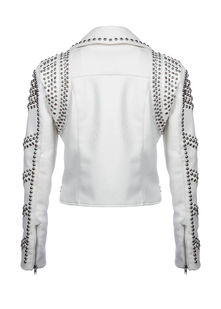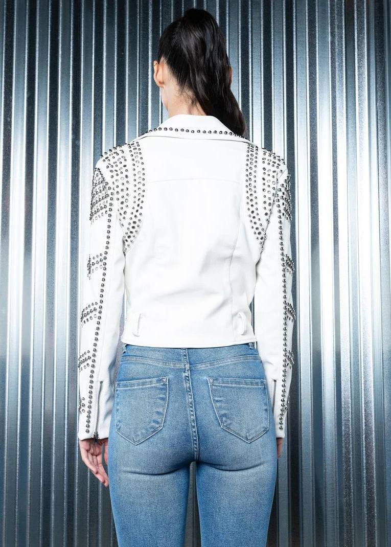 Take your stylish attitude to the next level with this show-stopping white moto jacket! Put your bold look on display in this one of a kind biker jacket that is made out of soft white faux leather and accessorized with all over silver colored stud details.