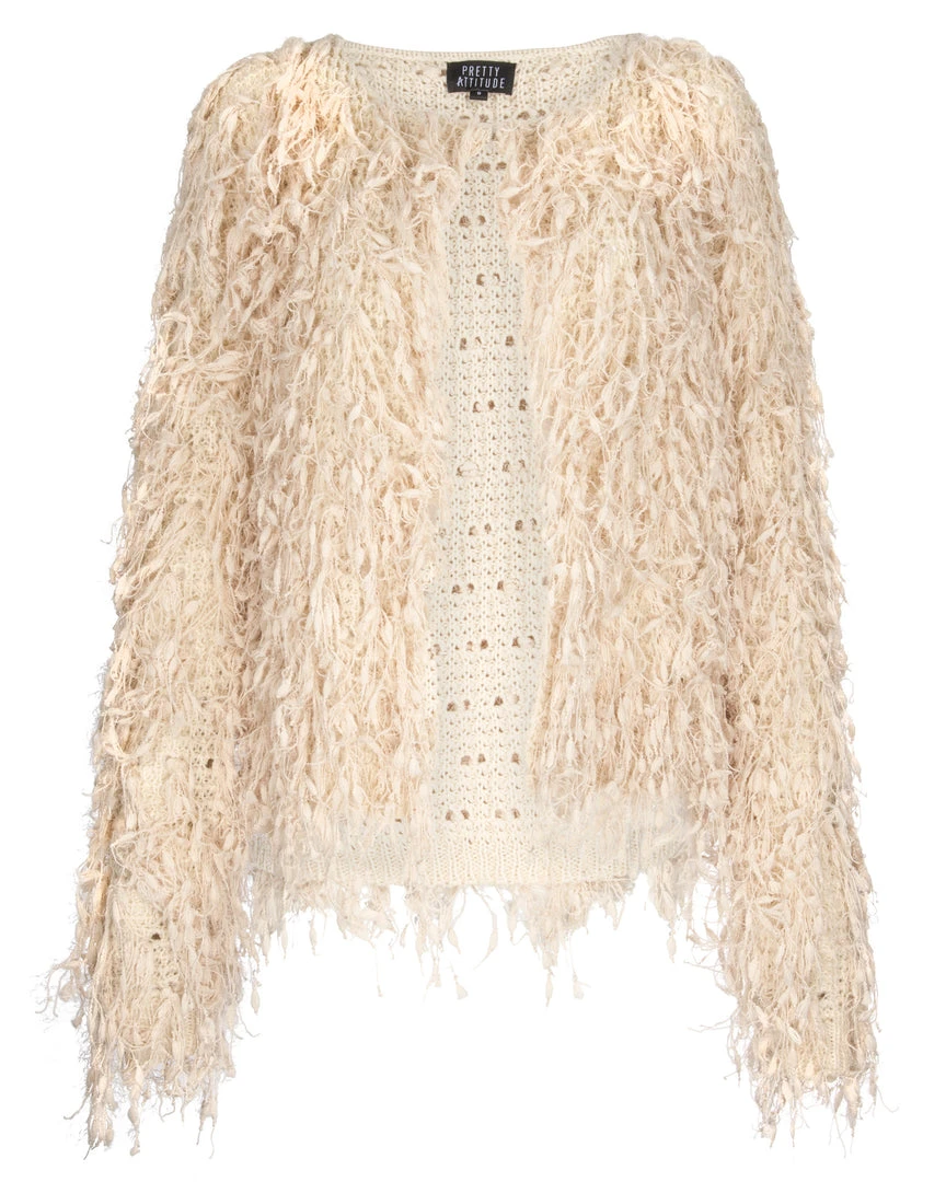 This beautifully crafted beige knit cardigan is accessorized with cool fringe throughout. This open jacket has long sleeves,a top hook closure and a straight hemline.