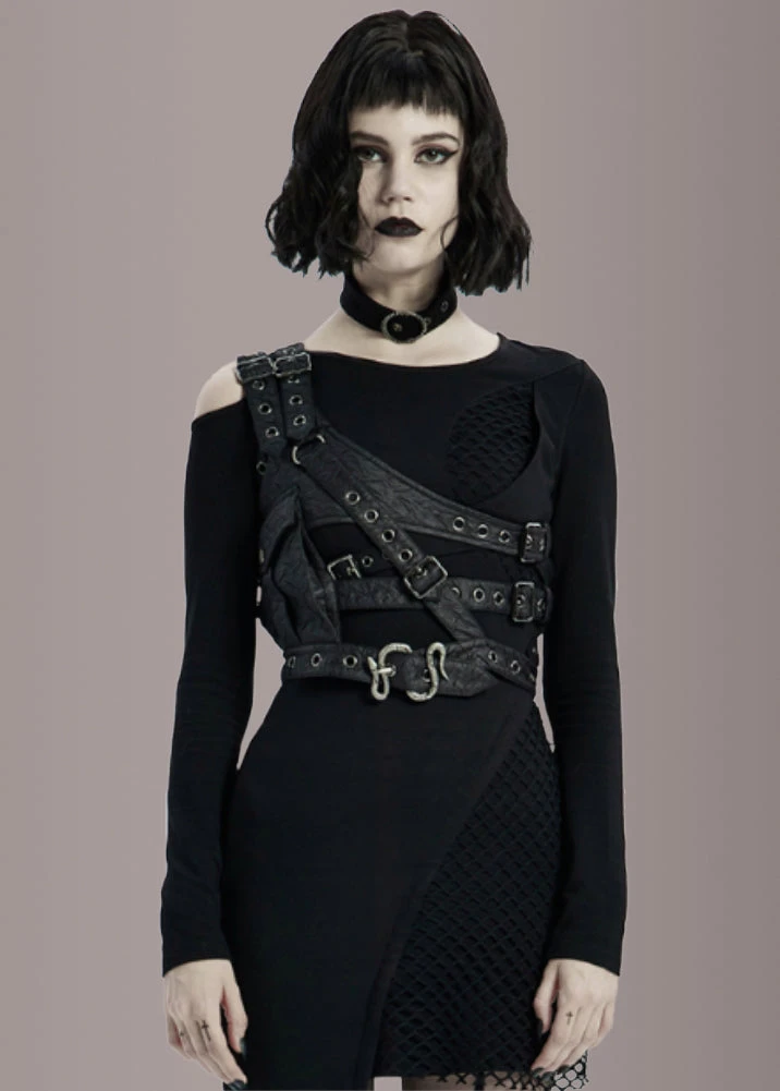 The top is made out of a beautiful fabric that has an embossed texture. The top also showcases a front pocket, several straps with metal eyelets as well as python snake buckle closure to complete the edgy look.