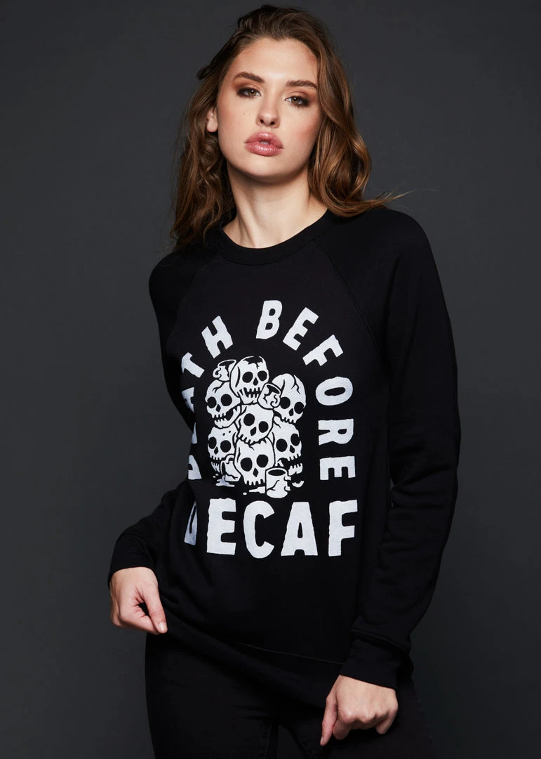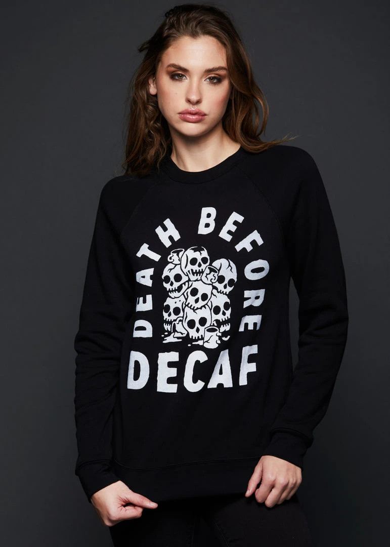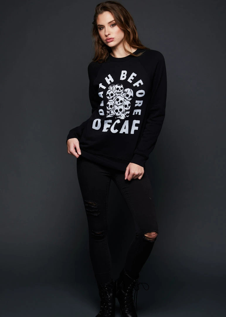 This unique coffee graphic sweatshirt by Pyknic features a pile of skulls and coffee mugs accompanied by one of the most popular coffee sayings ‘Death Before Decaf’.
